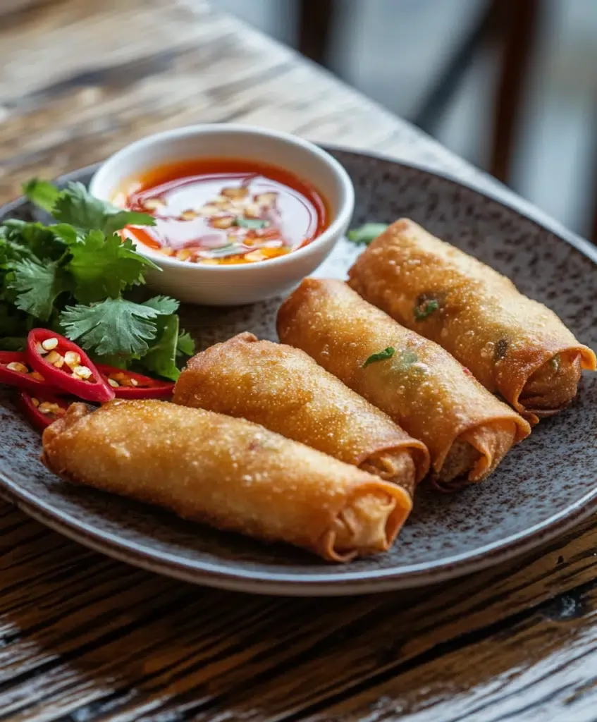 Sobald die Frühlingsrollen goldbraun und knusprig sind, nimm sie heraus und lasse sie 1-2 Minuten abkühlen. Serviere sie mit einer süß-sauren Soße oder einem Dip deiner Wahl.